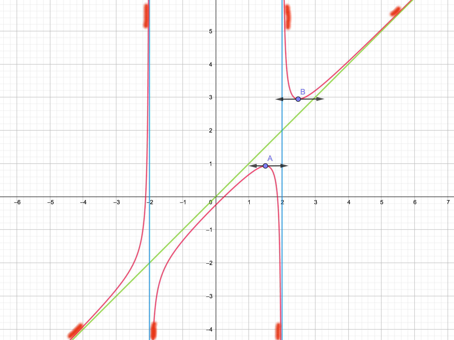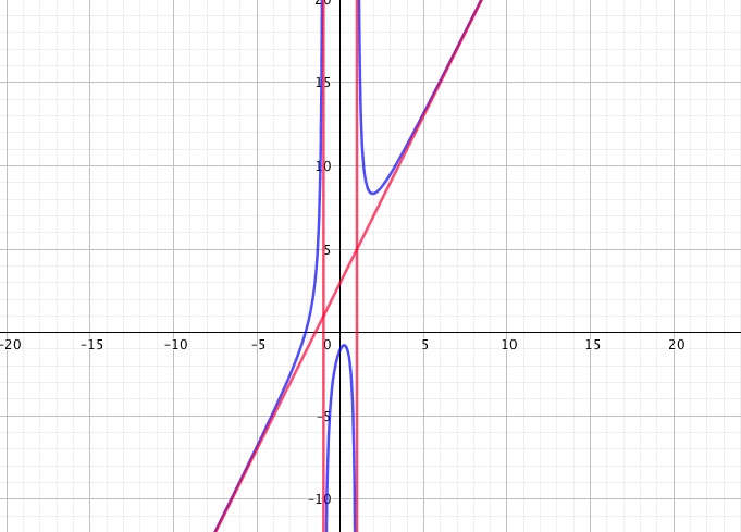 2. On trace les asymptotes éventuelles (dans notre exemple, deux verticales bleues et une oblique verte). Puis d'un petit trait (rouge ici), la position de la courbe par rapport à ces asymptotes (à droite, à gauche, en dessus, en dessous).