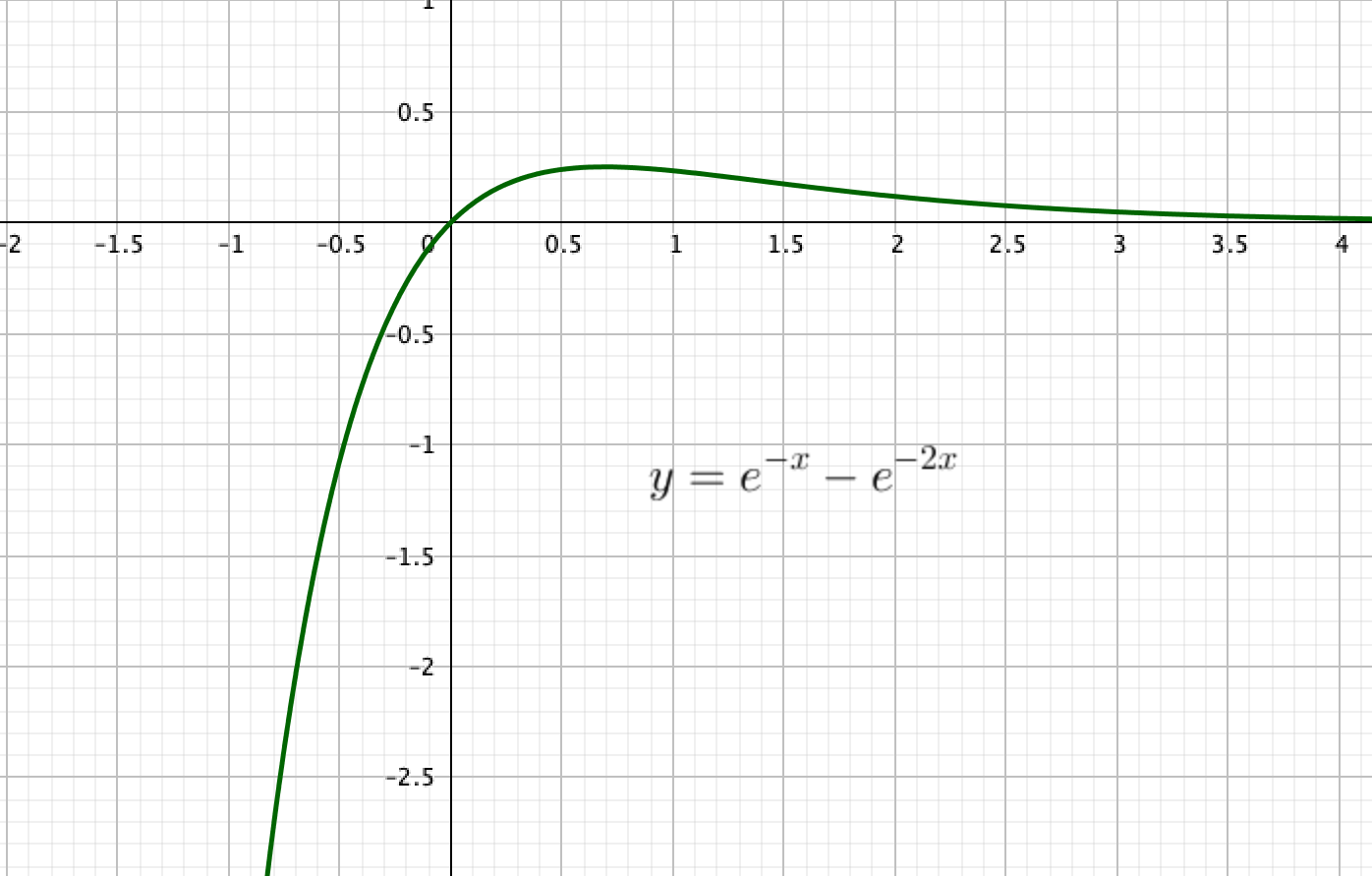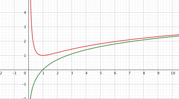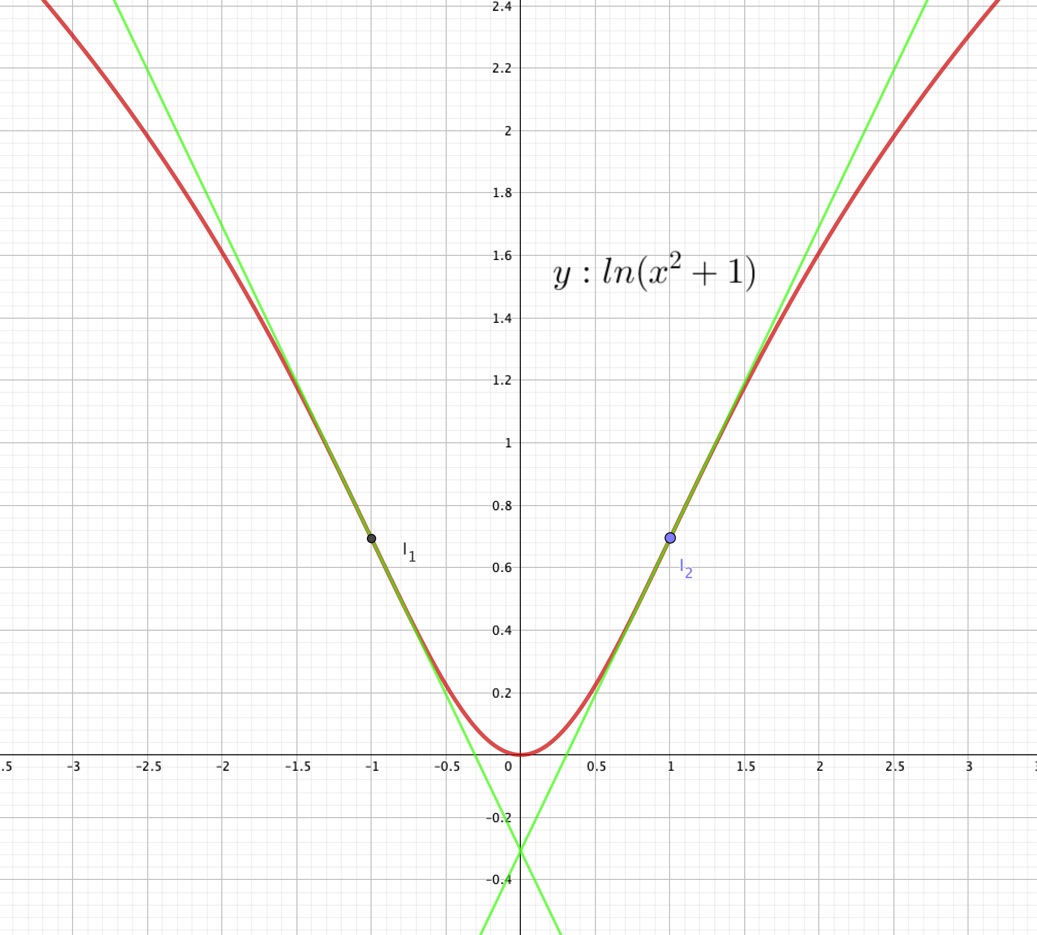 Deux points d'inflexion aux points d'abscisse x=1 et x=1. On notera que l'on a fait figurer sur la représentation graphique jointe ci-dessous les tangentes aux points d'inflexion : y=x+ln21 et y=x+ln21 (en vert) qui traversent la courbe.