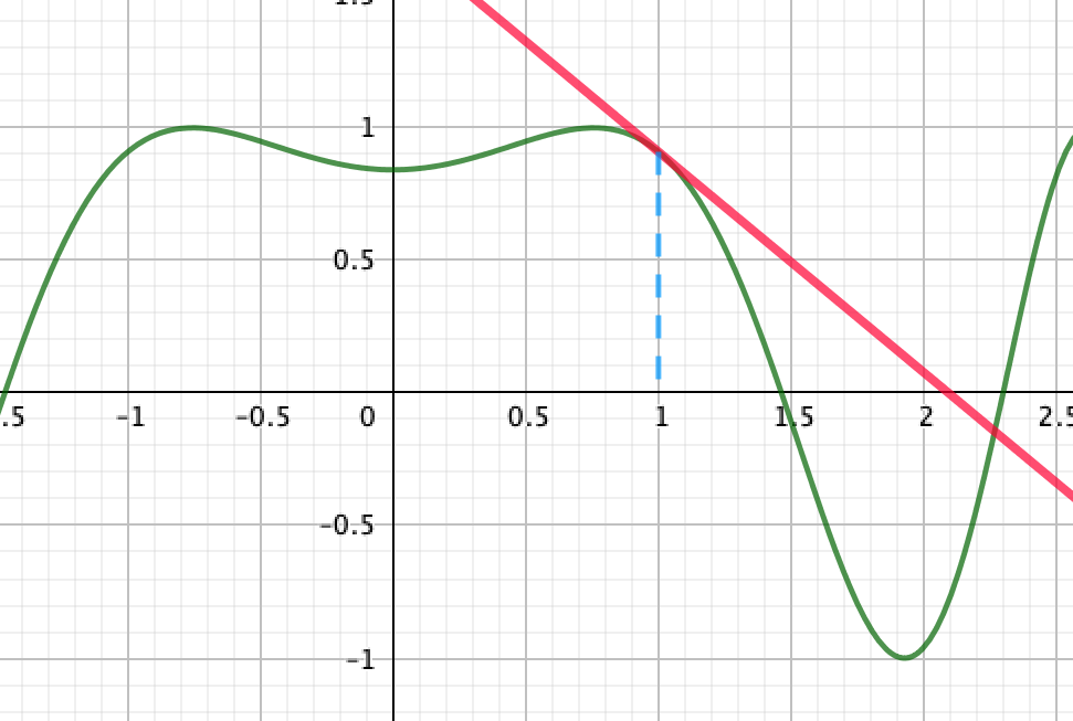 Les courbes sont en rouge, les tangentes en pointillé vert et les cordes en bleu.