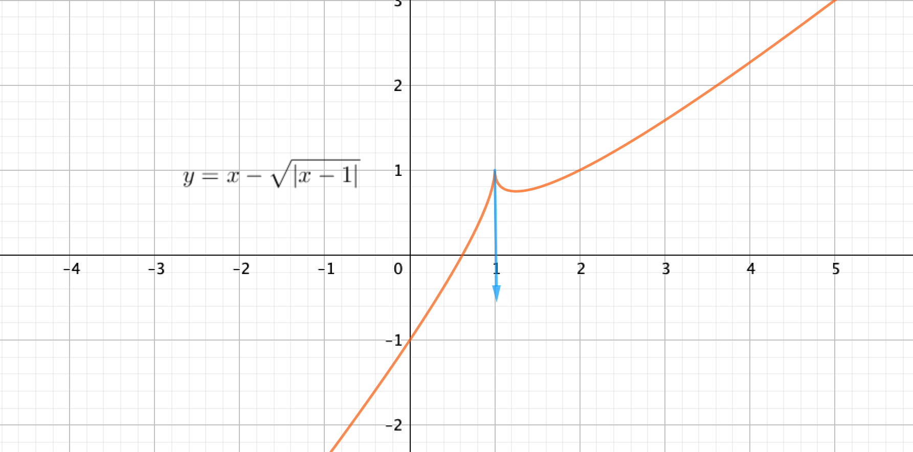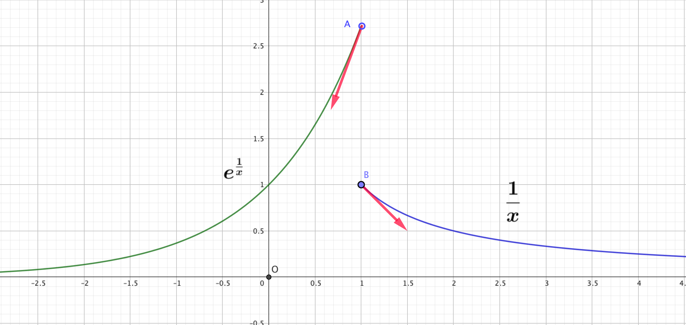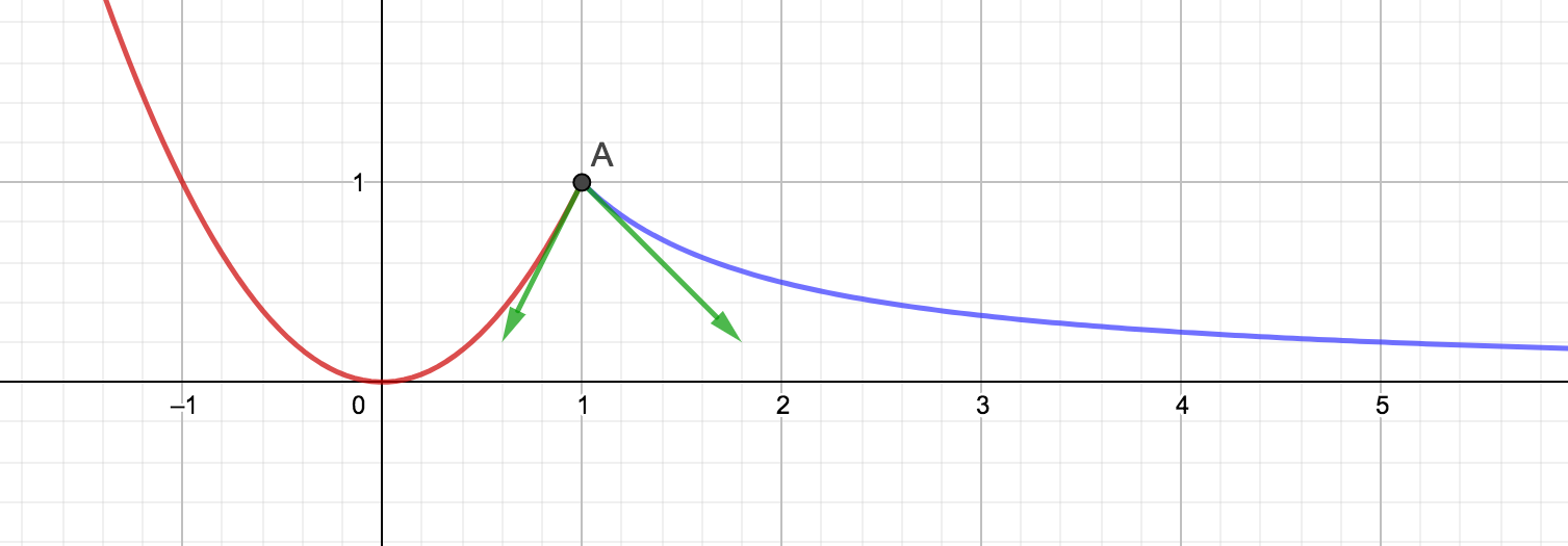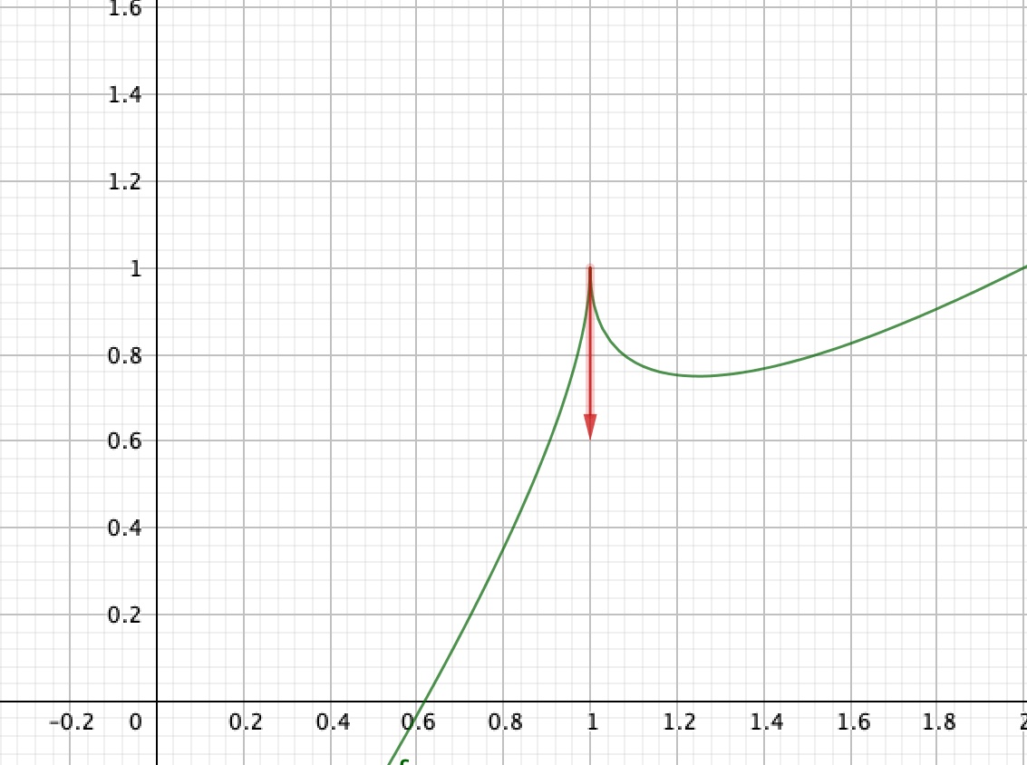 2. À droite sur ]1,+[ : on forme χ(x)=1x11x1=1x qui tend vers -1, lorsque x tend vers 1 +. Au point de coordonnées (1,1) la courbe admet une demi-tangente à droite de coefficient directeur - 1.