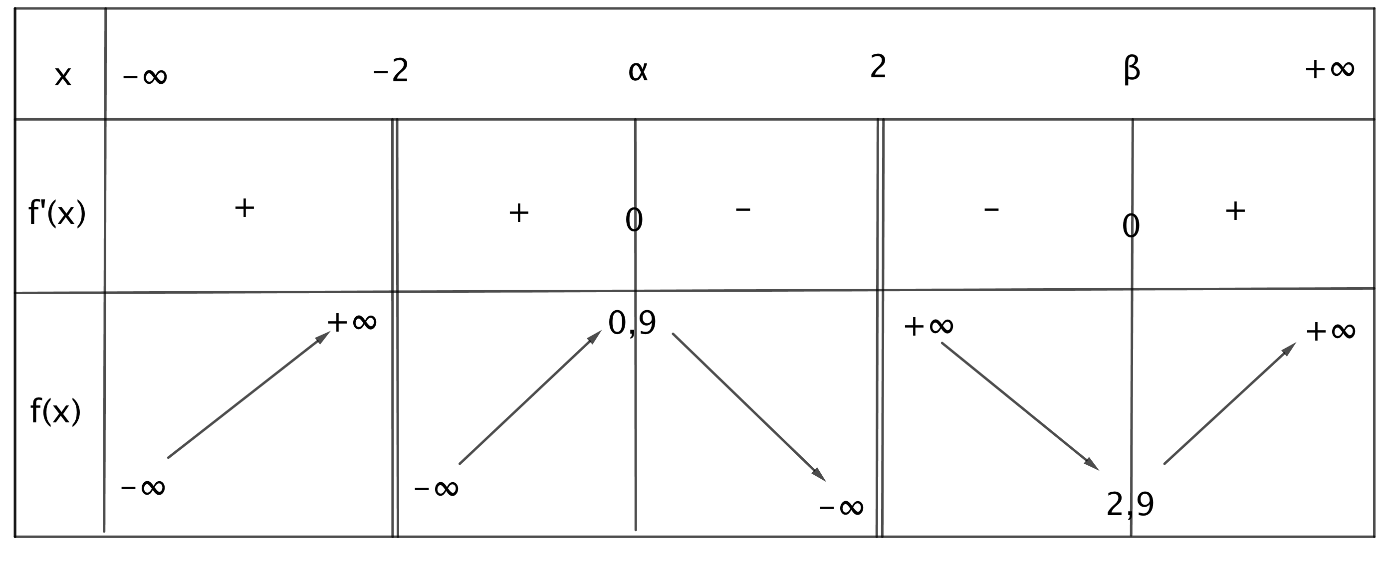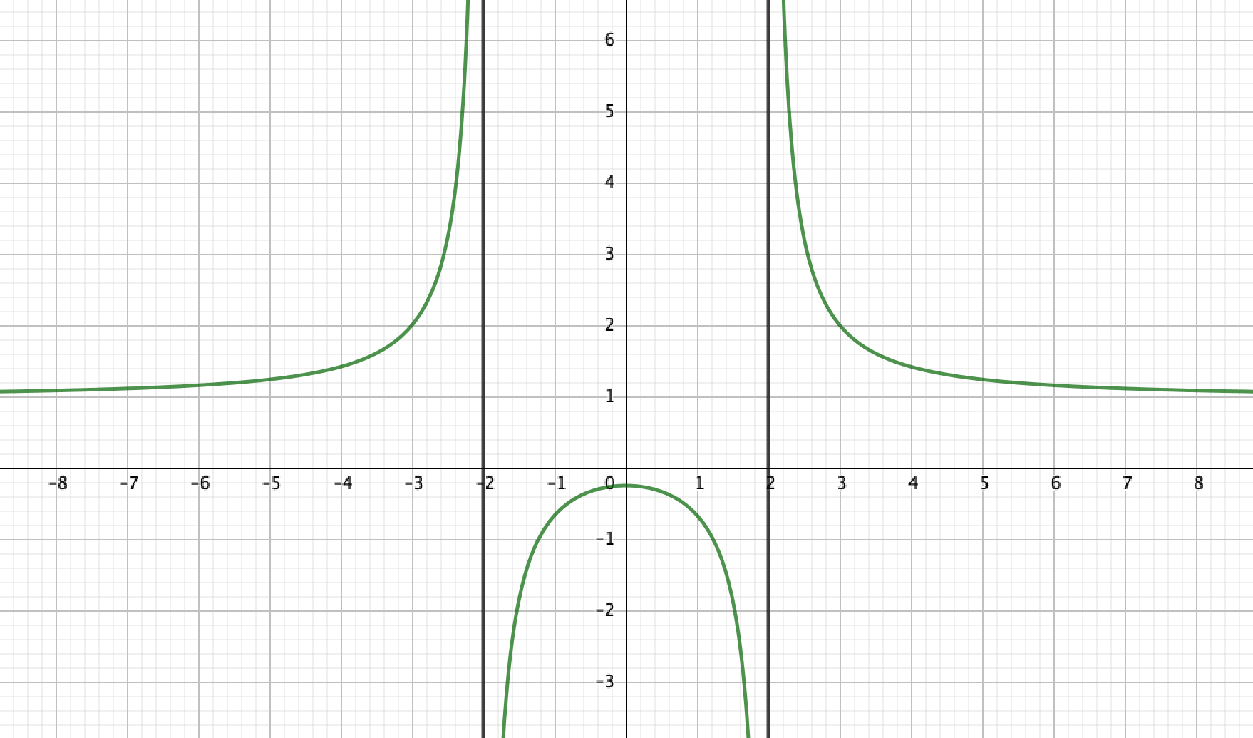 On reprend le tableau de variation de la fonction définie par f(x)=x+1x 24 définie sur \{2,2}, déjà vue dans ce document. Rappelons que les tableaux de variation tiennent compte des réductions éventuelles du domaine d'étude provenant de remarques de parité et de périodicité. Dans celui-ci, une seule chose ne figure pas : l'existence d'une asymptote oblique d'équation y=x, qui a été déterminée par ailleurs, et le fait que la courbe est au-dessus de celle-ci en et en +.