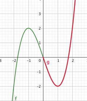Remarque : la dérivabilité n'est pas une condition nécessaire pour avoir un point d'inflexion. Voir par exemple la fonction définie sur par f(x)=x3 qui, en 0, n'est pas dérivable, admet une tangente verticale et change de concavité.