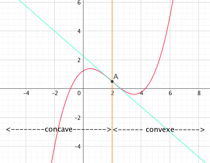 La courbe représentative de f est en rouge, la tangente au point d'abscisse 2 est en bleu. A est un point d'inflexion. La droite orange sépare le plan en deux parties, à droite, c'est-à-dire sur [2,+[, la fonction est concave (la courbe tourne sa concavité vers le bas), et à gauche sur ],2] elle est convexe (la courbe tourne sa concavité vers le haut).