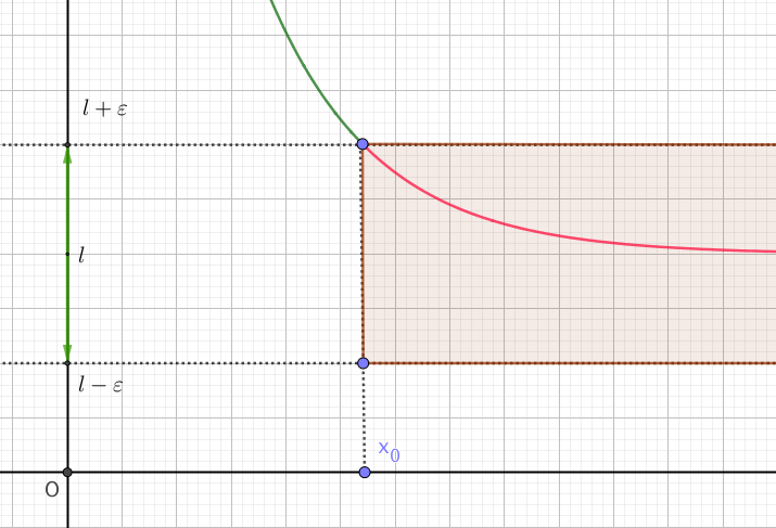 Si lim x+f(x)=l alors, géométriquement parlant, cela signifie que, pour des valeurs de x supérieures à x 0, les points (x,f(x)) sont dans la bande horizontale ]lε,l+ε[, quelque soit le réel positif ε.